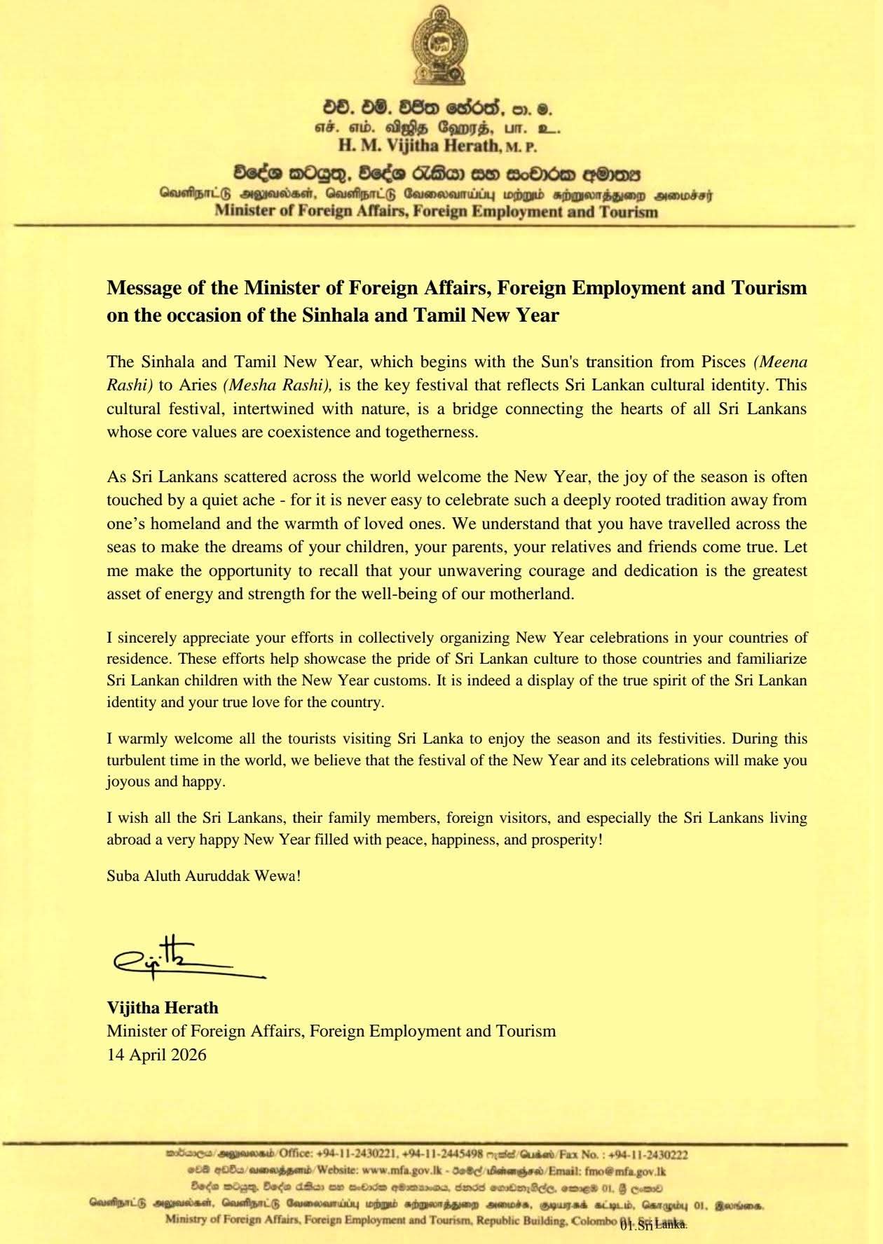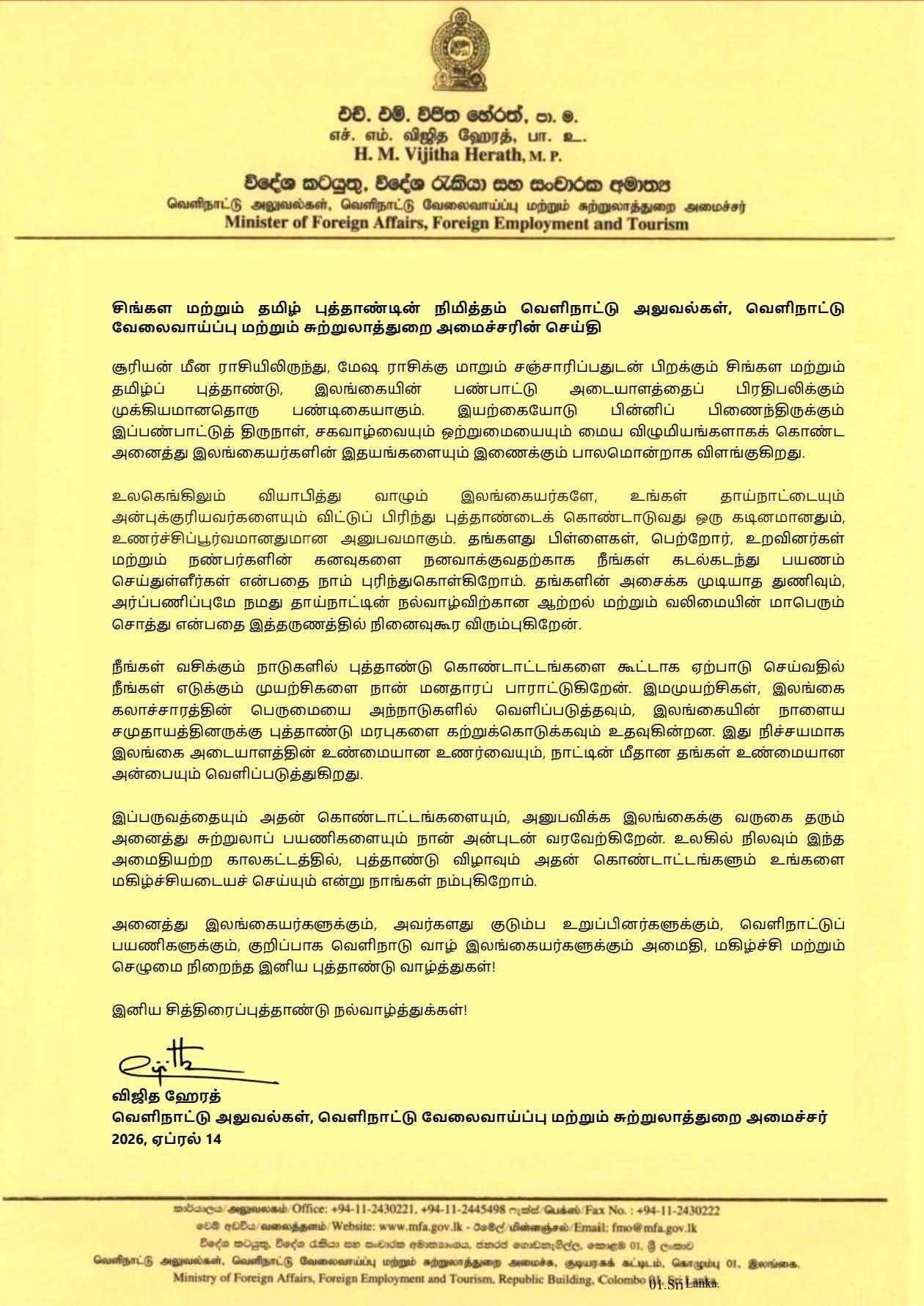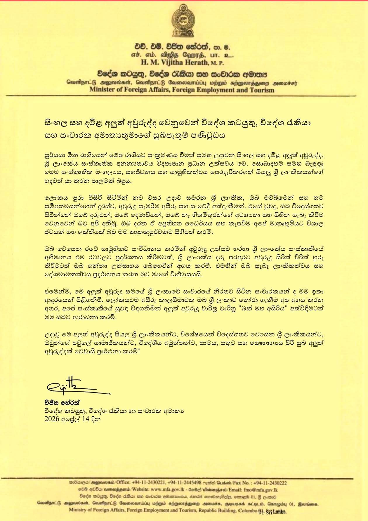 News April 14, 2026 Author: Dhananjaya Message of the Hon. Minister of Foreign Affairs, Foreign Employment and Tourism on the occasion of the Sinhala and Tamil New Year